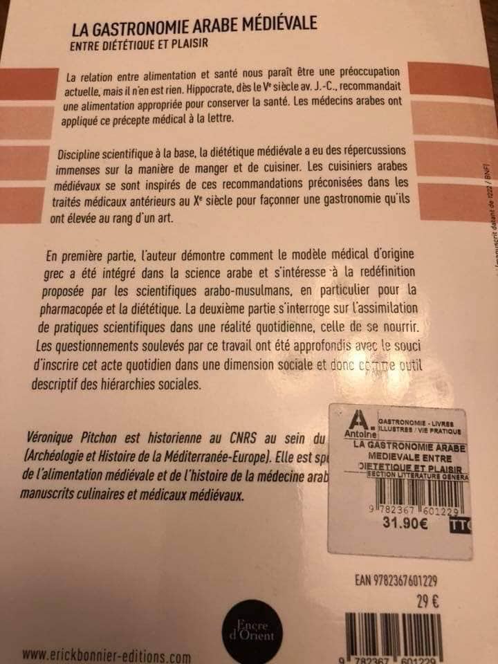 كتاب ضخم وشهي من حوالي 600 صفحة عن فنّ الطبخ العربيّ في العصر الوسيط. من إصدارات العام 2018. أفرحني اقتنائي له. نادرة الكتب التي تهتمّ بثقافة الطعام في عالمنا العربيّ. كتب الطبخ كثيرة، ولكن الكتب عن ثقافة الطعام قليلة جدّاً للأسف، الكتب التي تغوص في دلالات الطعام الفكرية والروحية والاجتماعية وصراع الطبقات تكاد أن تكون معدومة في اللغة العربية، والكتاب غنيّ جدّا بالمراجع العربية التراثية التي استعانت بها الكاتبة فيرونيك بيتشون Véronique Pitchon لإنجازه وكذلك بالمراجع الفرنسية والانكليزية والاسبانية والألمانيّة. آمل أن تهتمّ دور النشر بترجمة هذا الكتاب إلى العربيّة