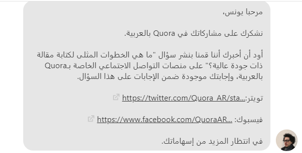 وقورة تختار إجابتي على سؤال: ما هي الخطوات المثلى لكتابة مقالة ذات جودة عالية؟ لنشره في حساباتها الرسمية على كلٍّ من تويتر وفيسبوك، وأدناه رسالة مدير المجتمع العربي: