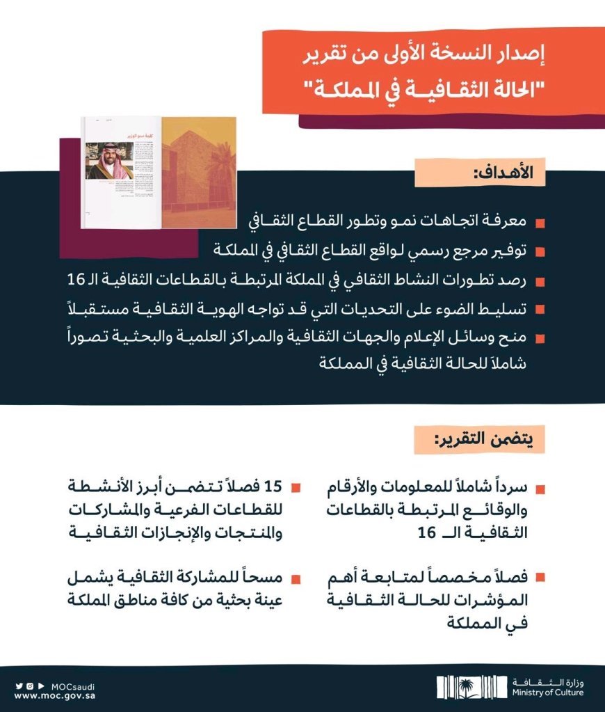 تقرير يجدر الاطلاع عليه أصدرت وزارة الثقافة السعودية نتائج دراسةٍ بحثيةٍ أجرتها لمعرفة واقع القطاع الثقافي السعودي تحت عنوان “تقرير الحالة الثقافية في المملكة العربية السعودية 2019″ ملامح وإحصائيات” والتي تضمنت سردًا شاملًا للمعلومات والأرقام والوقائع المرتبطة بالقطاعات الثقافية الستة عشر التي اعتمدتها وزارة الثقافة في وثيقة رؤيتها وتوجهاتها والتي تتحرك فيها بوصلة الإبداع السعودي. حمّل التقرير مباشرة من هنا. (تبغى) لمحة عن التقرير؟ أنظر الصورة أدناه: