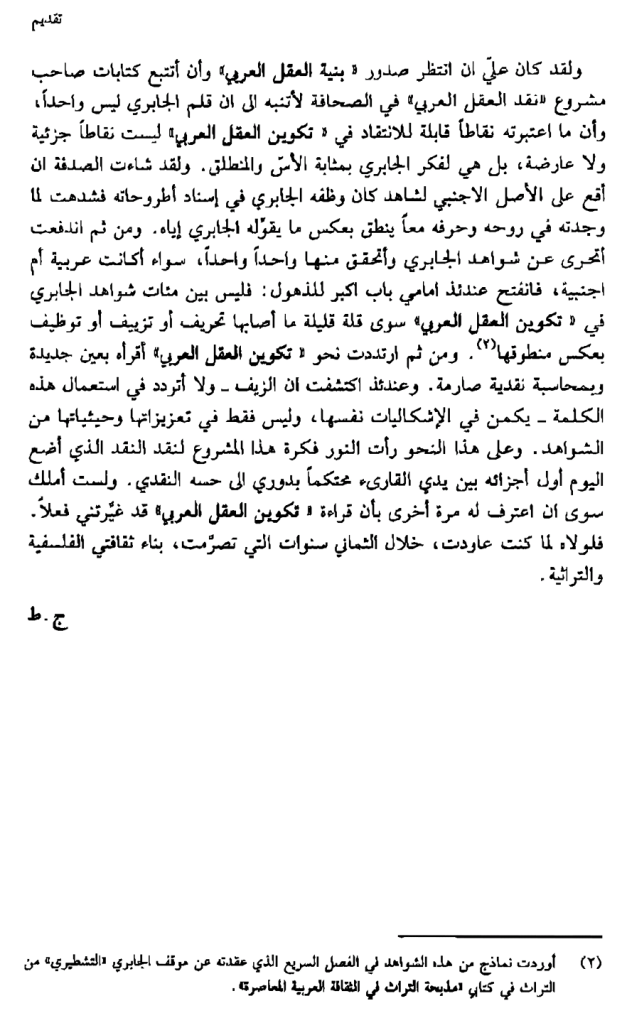 وفي فرنسا تيسَّر لي أن ألتقي الدكتور جورج طرابيشي والأستاذ فيصل جلول، وهما كانا قد أظهرا الكثير من الثغرات الفادحة التي احتوى عليها مشروع الجابري… وطرابيشي تحديداً وضع يده على الكثير من الإخفاقات الأكاديمية الفادحة في مشروع الجابري.
