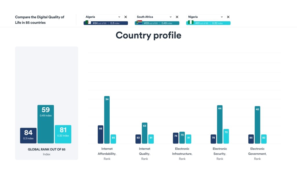 - ترتيب الجزائر من بين 85 دولة تناولها مؤشر الجودة الرقمية للحياة للعام 2020، المُعدّ من قبل شركة سُرف شارك Surfshark، ضعيف جدًا من حيث الجودة الرقمية للحياة. وليس بين الجزائر وبين الرتبة الأخيرة إلا جمهورية هندوراس.