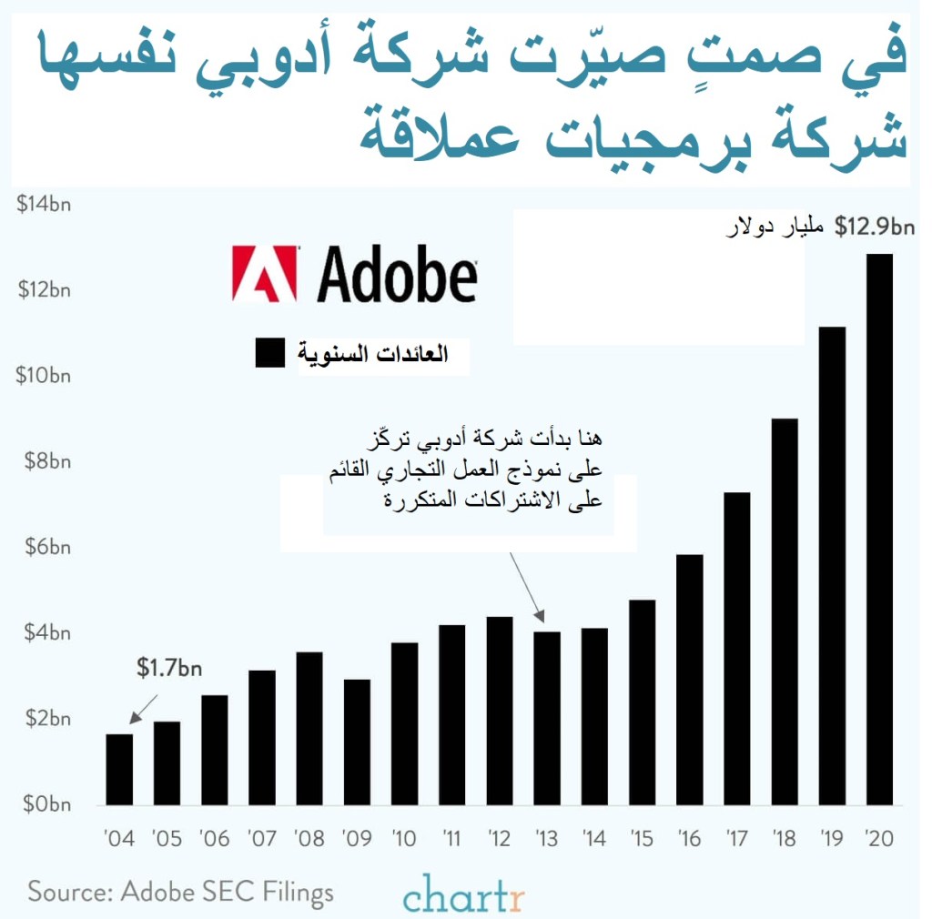 في عام 2013، تحوّلت الشركة نحو اعتماد نموذج عمل تجاري قائم على الاشتراكات المُتكررة، ومن ثَمة نمت عائداتها باضطراد كل عام. والعام الماضي بلغت إيراداتها 13 مليار دولار تقريبًا، مع هامش أرباح هائل قدره 87%.