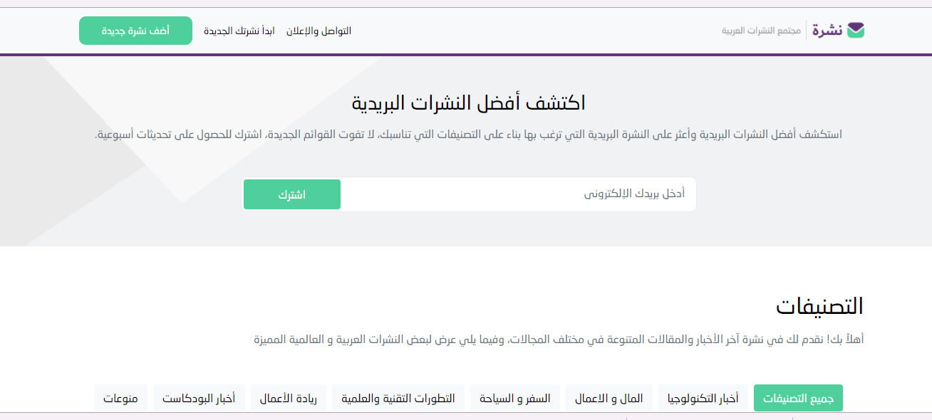 استكشف أفضل النشرات البريدية وأعثر على النشرة البريدية التي ترغب بها بناء على التصنيفات التي تناسبك، لا تفوت القوائم الجديدة، اشترك للحصول على تحديثات أسبوعية.
