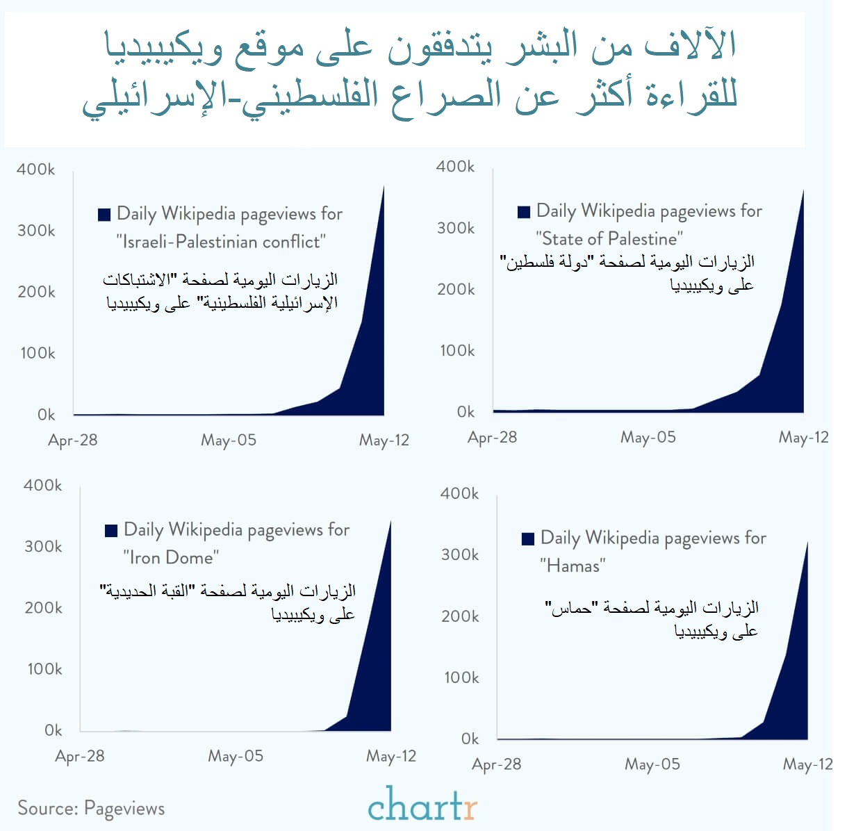 ووجد معدّو نشرة كارتر (chartr.co) مستعينين ببيانات مستمدة من أداة زيارات الصفحة (Pageviews) أن 6 من بين الصفحات العشرة الأكثر زيارة على الموسوعة الإلكترونية أمس لها علاقة بالصراع، حيث استقطبت كل صفحة من تلك الصفحات الستة مئات الآلاف من الزيارات.