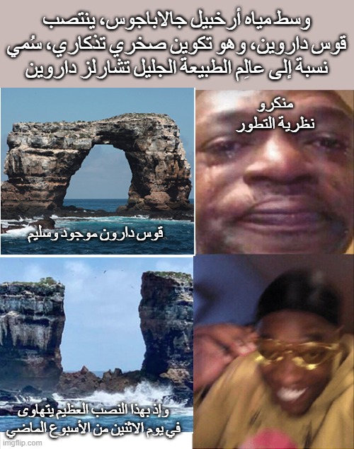 عندما يزعجك أحدهم وتكون وقحًا ستقول أن هذا الإنسان يُفكّر من #*$*، العلم لم يثبت استطاعة الإنسان التفكير من #*$* لكنه أثبت أن الثدييات يمكنها التنفس من مؤخراتها [نشرة العلوم من Nature الطبعة العربية] وفي نفس العدد من النشرة نقرأ عن تهاوي “قوس داروين” ومنه صنعتُ هذا الميم: