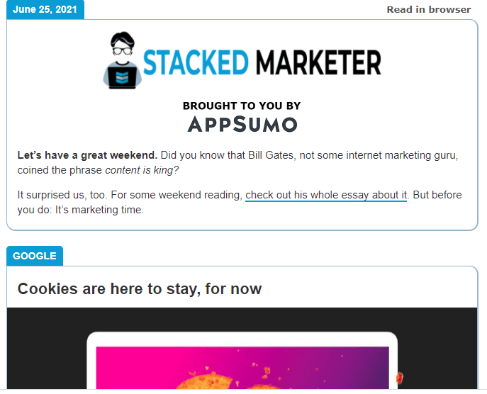 واليوم لما تفقدت بريدي الإلكتروني وصلتني رسالة من النشرة الممتازة عن التسويق ستاكد ماركتر التي نصحتكم بالاشتراك فيها مرارًا هنا، وأكرر ذلك مرة أخرى. اشترك بها من هذا الرابط فهي تستحق [رابط إحالة]