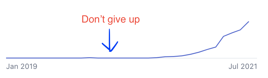 إن اختيارك لفكرة ليست اتجاهًا رائجًا حاليًا وسريع الزوال؛ وانتماء الفكرة لقطاع كبير ويُفضّل أن يكون آخذًا في النمو، يُمكنك من سلوك درب تطوير بطيء للغاية. طالما أنك مستمرٌ في العمل على حلّ المشكلة، سيتراكم لديك لا محالة في إحدى المراحل، ما يكفي من مزايا المنتج والتي تستطيع بيع استخدامها مقابل المال.