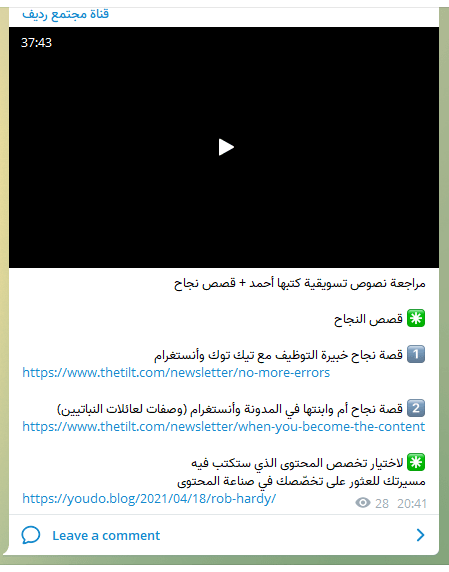 - ينشر قصص صناع محتوى (أحيانا يسميهم برواد أعمال المحتوى) واقعية ونافعة