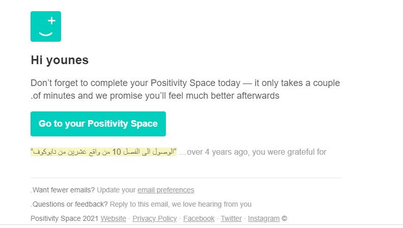 كما أخبرتكم من قبل، أنا مشترك في موقع مجاني يذكّرني كل يوم بأن أحمد وأشكر، وهو Positivity Space وأنا أفعل ذلك من سنوات، وعندما يكون لديك حساب هناك وتكتب ما تشكر الله عليه يوميًا هناك يُرسل لك أحيانًا ما شكرت عليه من قبل مثل هذه الليلة أرسل لي: