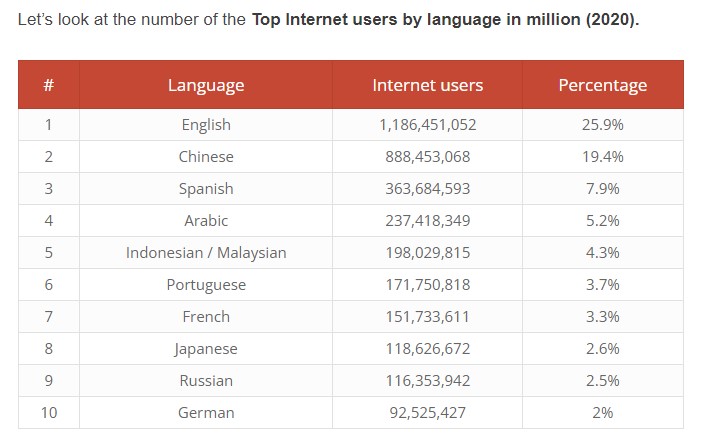 وإذا ما أضفنا لها هذه الإحصائية عن أكثر اللغات استخدامًا في الإنترنت (الصورة أدناه) سنرى أن العربية في المرتبة الرابعة متفوقة على لغات مثل البرتغالية والفرنسية واليابانية والروسية وغيرها. مما يعني وجود سوق عظيم بِكر للمحتوى العربي.