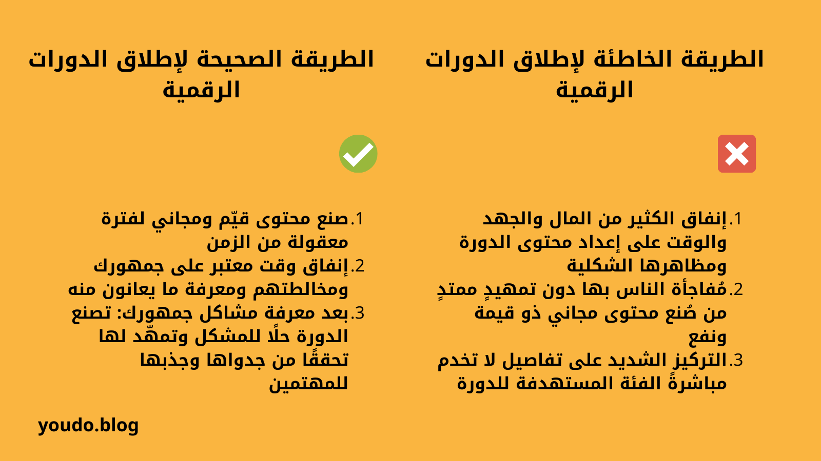 يقع الكثيرُ ممن يرغب في إطلاق دورة رقمية في خطأ شائع، يمكن تجنّبه بسهولة. وهذا الخطأ هو البدء من نفسك لا من حاجات الجمهور. مما يؤدي لفشل إطلاق الدورة ومن ثَم إحباط صاحبها.