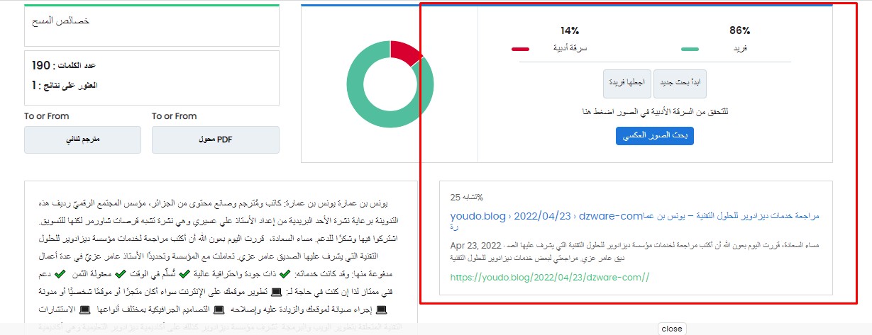 لاحظ أن مقالي مراجعة خدمات ديزادوير للحلول التقنية أصلي مئة بالمئة لأن البرنامج يخرج لي أني أخذت جزءً منه من أين؟ من مقالي ذاته. الحكمة هنا أن الأداة تعطيك نظرة ومما أُخذ المحتوى لا سيما إن لم تنشره بعد. لذا استخدم مثل هذه الأدوات بتحفظٍ.