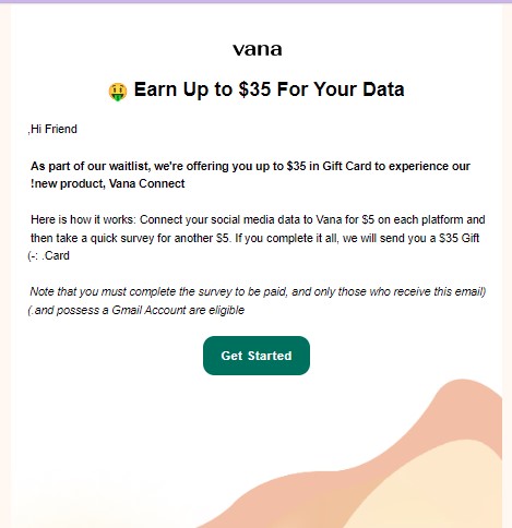 فتطبيق مثل Vana أرسل لي ذات مرة أنه إن نزّلت بياناتي في فيسبوك وتويتر وغيرها ورفعتها له وأتممت استبيانًا فسيعطيني 5 دولار مقابل كل حزمة بيانات في منصة اجتماعية بما يصل مجموعه لـ35 دولار.