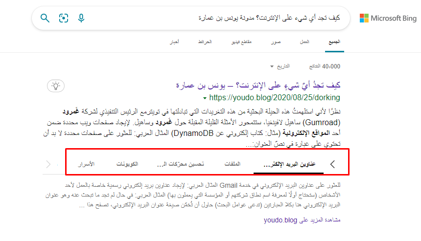 ثم أدرج ليم هاو صورة بصفتها مثالًا وها نحن ندرج مثالًا عربيًا على ظهور روابط القفز بصفتها عناوين فرعية في نتائج محرك البحث: