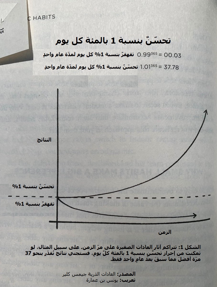 ليس هناك أبينُ من كتاب جيمس كلير العادات الذرية في توضيح قوّة مراكمة العادات الصغيرة التي تنجزها كل يوم. وتجني ثمارها بنهاية كلّ عام. شاهد الصورة أدناه فهي تشرح بدقّة هذه الفكرة 👇