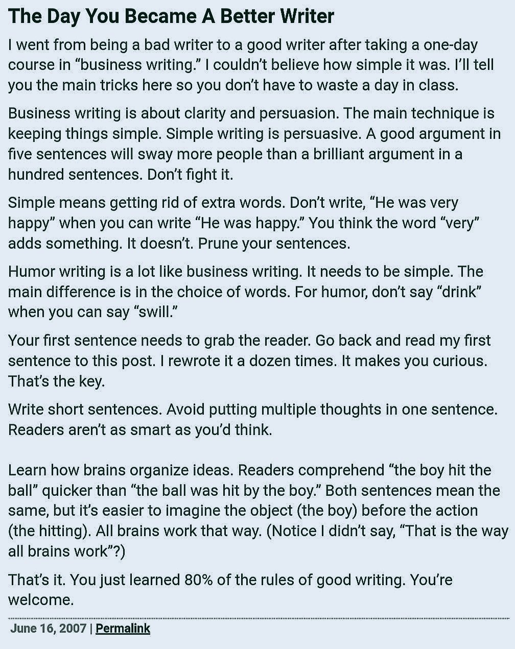 - من أفضل المقالات هو مقال “اليوم الذي تغدو فيه كاتبًا أحسن” وهو من تأليف سكوت آدمز الذي راجعت كتابًا له من قبل هنا في هذا المقال مراجعة غير مكتملة لكتاب «كيف تُخفق في كل شيء تقريبًا ومع ذلك تَغنمُ كثيرًا»
