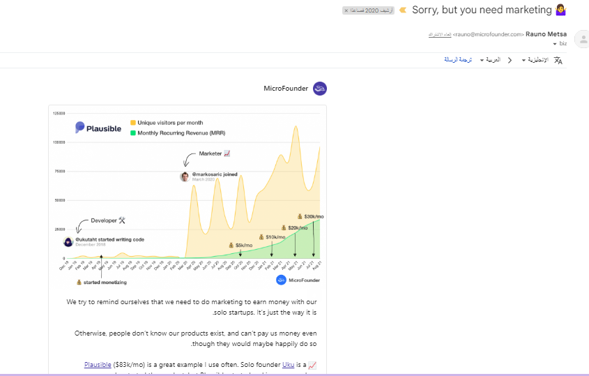 لاحظ مثلًا بخصوص المهارة الأولى والتي يتجاهلها معظم المبرمجين وغيرهم. هنا نجد في أحد أعداد نشرة موقع مايكروفاوندر (MicroFounder) أي المؤسس الصغرويّ -أي ذاك الذي يؤسس شركة برمجيات بنفسه ويتربّح منها- أنه لا مناص من التسويق ويستشهد كاتب العدد بتجربة أوكو (Uku) الذي عندما تعاون مع المسوّق ماركو حدثت الطفرة كما تلاحظ من منحنى نموّ شركته بلوزيبل (Plausible) التي تحقق الآن 83 ألف دولار في الشهر.