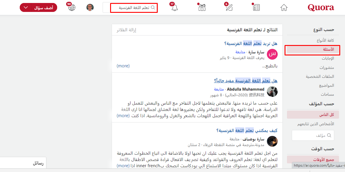 - ابحث بعبارات تنتمي لمجالك مثلًا في حالتنا “اللغة الفرنسية” و”تعلم اللغة الفرنسية” في كورا وفي قسم الأسئلة طالع ما يسأل عنه الناس هناك. مثال بالصورة أدناه 👇