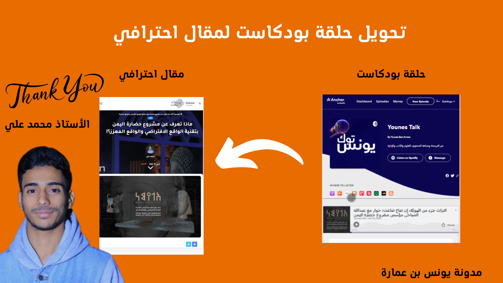 ما نحكي عنه هو تحويل احترافيّ لحلقة بودكاست إلى مقال احترافي وإليك الطريقة التي أخبرت بها المشترك في رديف الأستاذ محمد علي فحوّل حلقة بودكاست حوارية لي بعنوان التراث جزء من الهويّة، إن ضاع ضاعت: حوار مع عبدالله السباحي مؤسس مشروع حضارة اليمن إلى مقال احترافي بعنوان ماذا تعرف عن مشروع حضارة اليمن بتقنية الواقع الافتراضي والواقع المعزز؟! نُشر في موقع مرموق.
