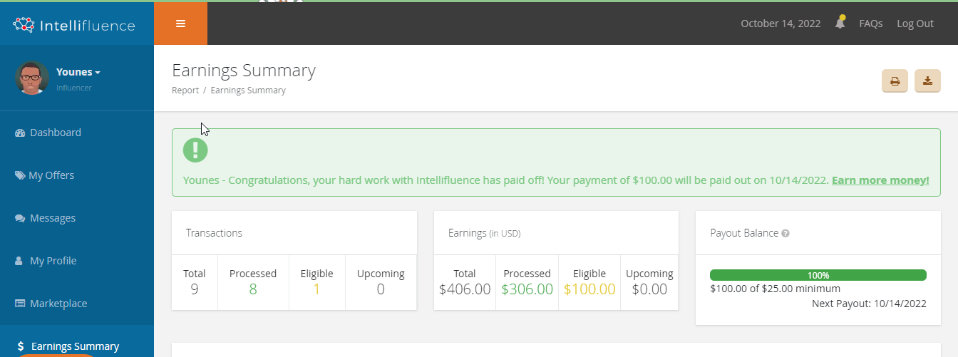 - الرعايات. يمكنك فتح باب رعاية محتواك حيث يدفع الناس لك المال دعمًا لكتاباتك. طالع هذا الدليل الوافي مني لتعرف كيف ترعى محتواك ماليًا: كيف ترعى ماليًا المحتوى الذي تصنعه؟ تستطيع استقبال المال عبر بايبال ووضع زرّ دفع في ووردبريس بيُسر وسهولة أو استخدام مواقع رعايات مثل Intellifluence [رابط إحالة] (اُنظر الصورة أدناه لتجد إثباتًا على جني 406 دولارات من هذا الموقع وفق تجربتي معه).