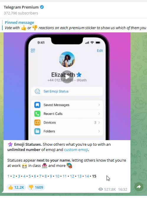 يعمل تيليجرام على إضافة مزايا جديدة للنسخة المجانية والمدفوعة بوتيرة دورية. بالنسبة للنسخة المدفوعة فإن التحديثات بشأن الجديد تجدها في قناة مخصصة لذلك هذه لمحة منها في صورة متحركة أدناه: