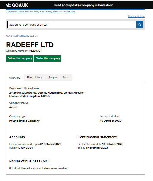 وفي غضون ثلاثة أيام ولدت شركة رديف المحدودة في المملكة المتحدة وهي مسجّلة هناك تحت رقم 14428939 والحمد لله رب العالمين وأرسلوا لي كل الوثائق بصيغة بي دي إف إلى بريدي الإلكتروني.