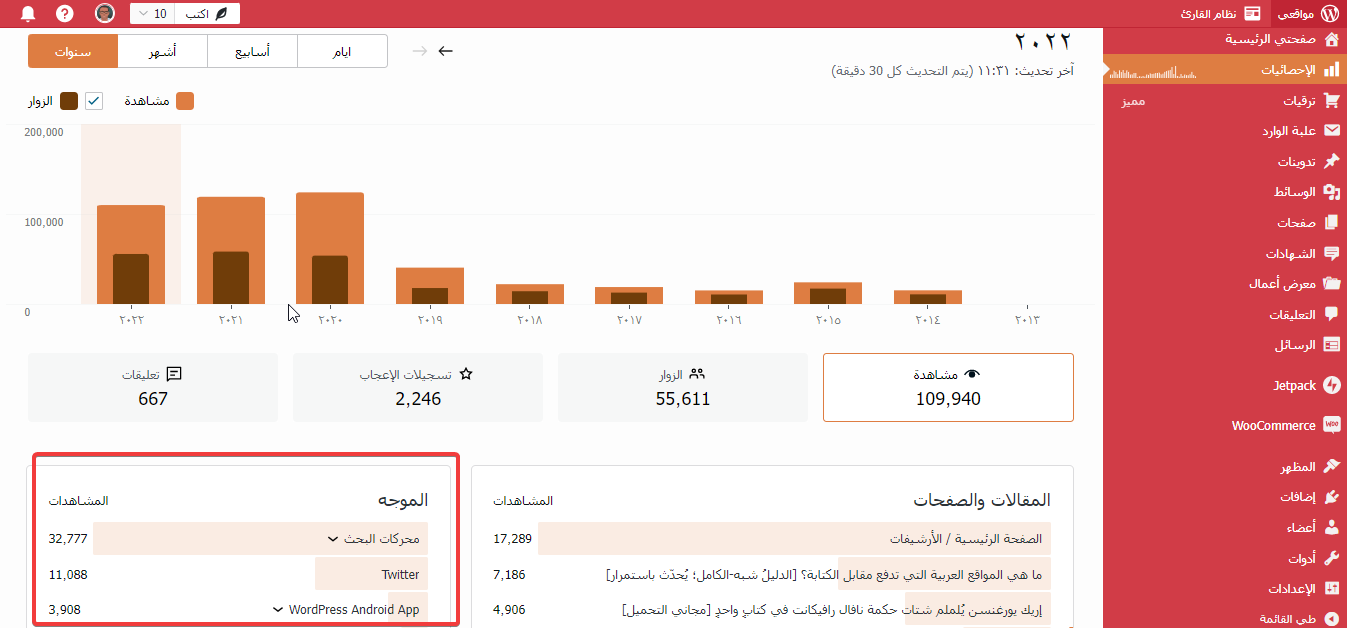 مع أنه لو نتأمل مصادر الزيارات لمدونتي سنجد أن أكبر مصدر لها هو محركات البحث إلا أن تويتر يتربع على الرتبة الثانية بصفته مصدرًا للزيارات للمدونة كما ترى في صورة إحصائيات العام 2022 لمدونتي أدناه.
