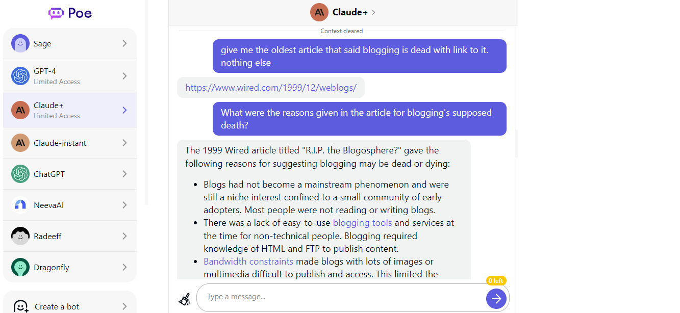 والنقطة الرئيسية في مقالي هذا هو أن المفاهيم والمجالات والأشياء لا تموت. وبدل الدليل على ذلك أتيت بعشرة أدلة مع العلم أنه يمكن لأي شخص إن كان يجيد البحث أن يأتي بمئات مثلها. وقلت شخصًا وليس ذكاء اصطناعيًا لأني جربته ولم يستطع أن يأتي بأدلة هذا المقال من مصادر يعوّل عليها على الرغم من كتابة مدخلات له واضحة ودقيقة ومحددة على سبيل المثال (وضمن بحث آخر ليس مصادر هذا المقال) لما كتبت له بالإنجليزية (التجربة كانت مع Claude-instant في بو من كورا): ائتني بكتب بوليسية وجريمة كتبتها إناث وبحيث تكون في الملكية العامة لا حقوق لها وكتبت له تأكد أن المؤلِّفات إناث وأن الكتب في الحقوق الملكية الفكرية العامة كان الذكاء الاصطناعي يأتيني بالكتب التي ألّفها رجال وبين قوسين يكتب “أنا أعرف أن مؤلف هذا رجل وآسف لأني وضعته هنا” وهو في الحقيقة لا داعي للأسف، لو كان الذكاء ذكيًا كما يقول أو له مُسكة من العقل لم يضعهم أساسًا ولقال لي أن ما طلبته غير موجود حد علمي. ولم أضع صور لقطات شاشة لمحادثاتي معه لأنها ستكون كثيرة جدًا ولا داعي منها إذ من يجرب الأدوات بما يكفي سيقابل عشرات المواقف الشبيهة بهذه؛ علمًا أنك لو حاولت أن تضع نفس الذي قلته لك هنا قد لا يخرج لك ما أخرجه لي والسبب أن هذه الأدوات تتدرب على مدخلاتنا وتتعلم بالوقت. المسألة أن تعلمها بطيء جدًا بنظري.