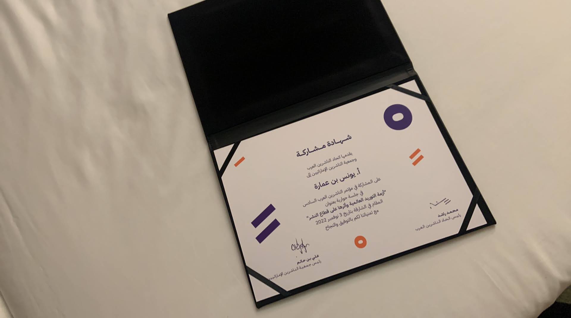 - حضرت بحمد الله بصفتي متحدثًا في مؤتمر الناشرين العرب السادس الذي أقيم بالشارقة نوفمبر 2022. وكرّمتني الشيخة بدور بنت سلطان القاسمي، رئيسة الاتحاد الدولي للناشرين. بالفيديو ملمح من مشاركتي في المؤتمر وأدناه صورة لشهادة التكريم. بعدها روابط ذات صلة بمشاركتي بالمؤتمر